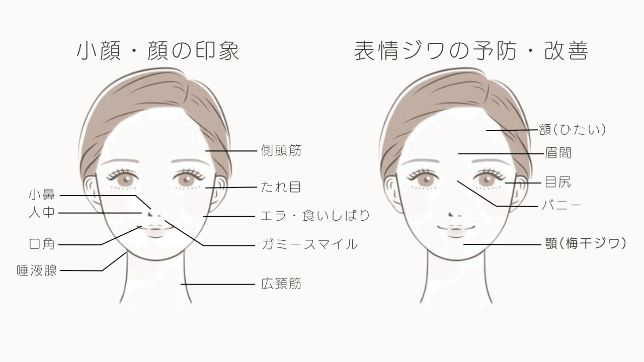 表情ジワからたるみ予防や小顔など部位によって効果が異なります。