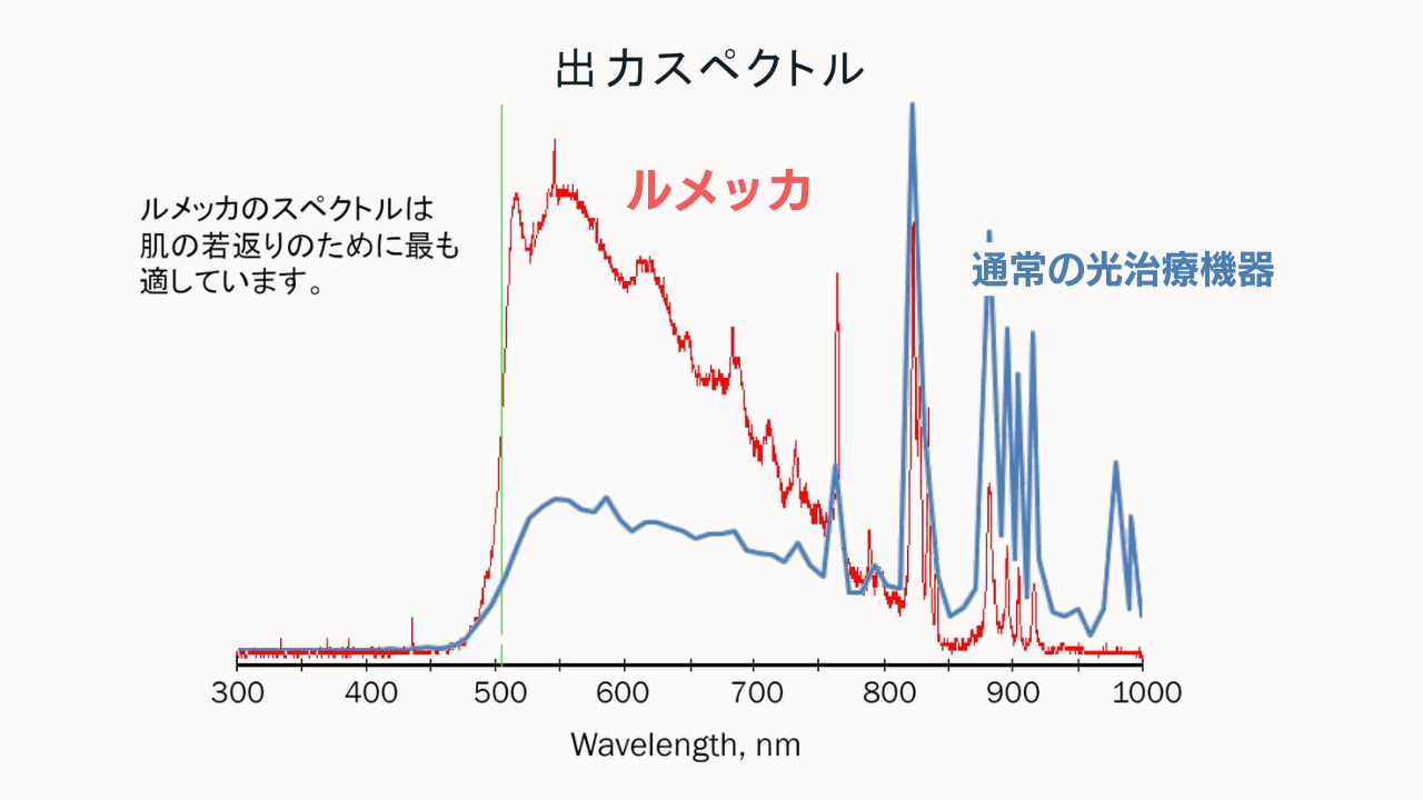 従来の光治療機器と比較して500nm~650nmの波長が多く含まれています。500nm〜700nmはメラニン・ヘモグロビンに対して最も効率よく反応する領域です。
