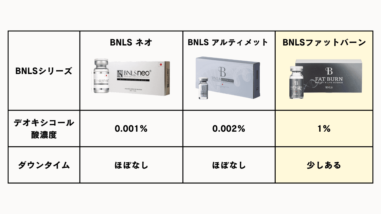 主要成分として、脂肪溶解に有効性の認められている『デオキシコール酸』を0.5% と高濃度(BNLS ネオの約5000倍の濃度)で配合しています。 従来のデオキシコール酸系の脂肪溶解注射と比較して、腫れや痛みが少ないのもポイントなので、ダウンタイムがとれずに手を出せなかった方にもおすすめです。