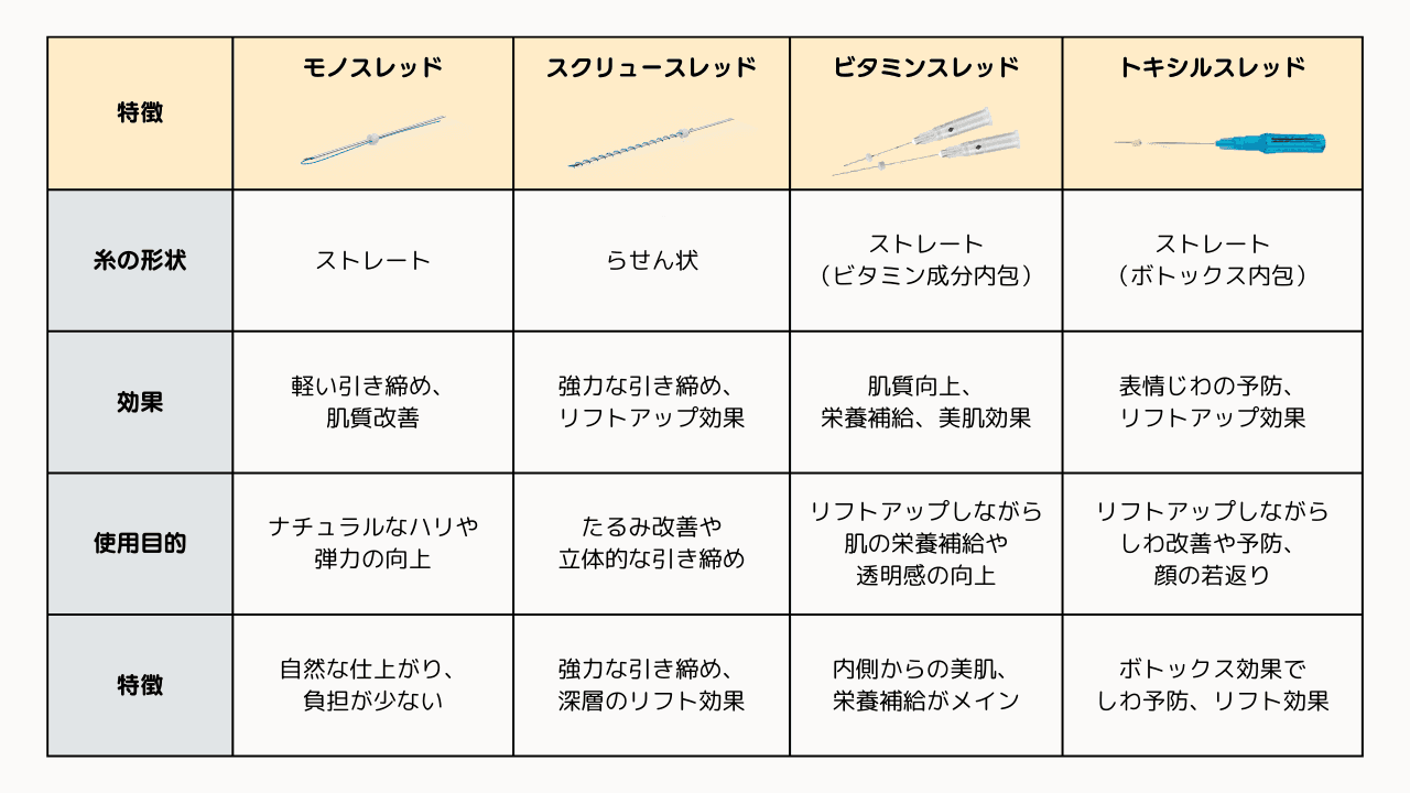 ショッピングリフトは 特殊な極細の溶ける糸を皮膚の浅い層に多数挿入する施術です。糸が肌の内部でコラーゲン生成を促し、肌のハリや弾力を改善します。糸は時間とともに体内で吸収され、自然なリフトアップ効果を得られるのが特徴です。当院では4つの種類の糸をご用意しております。