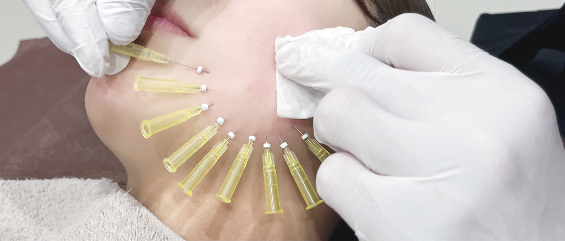ショッピングリフトは、特殊な鍼を使用して皮膚に挿入し、その中に内蔵された髪の毛よりもさらに細い吸収性の糸を埋め込む施術です。この施術は治療直後から即効性のある引き締め効果を実感できるだけでなく、埋め込まれた糸が約6~8か月かけて皮膚に吸収される過程で、皮下組織を刺激し続けます。その結果、創傷治癒効果が働き、長期的にはコラーゲン生成が促進されます。これにより、たるみの改善、新しい細胞の生成による肌質の向上、弾力のアップ、そして毛穴の改善が期待できます。