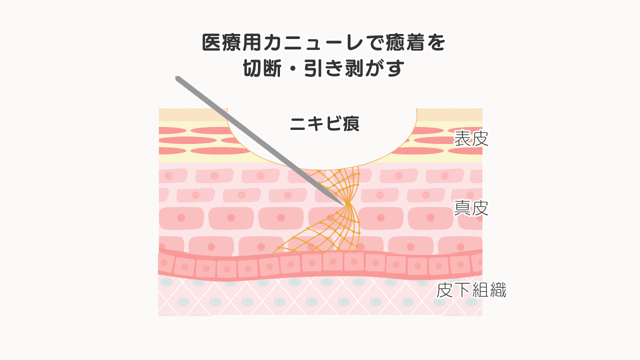 ニキビ跡クレーター治療。皮膚の下にある固く癒着した組織を針で切り、クレーターの陥没した部分を上に持ち上げる施術です。