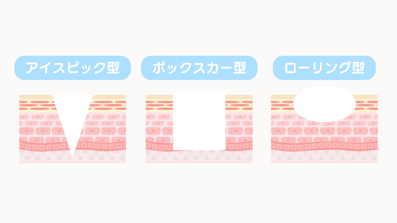 ローリング型のニキビ跡、ボックスカー型のニキビ跡に有効です。アイスピック型のニキビ跡には効果がでないことが多いです。