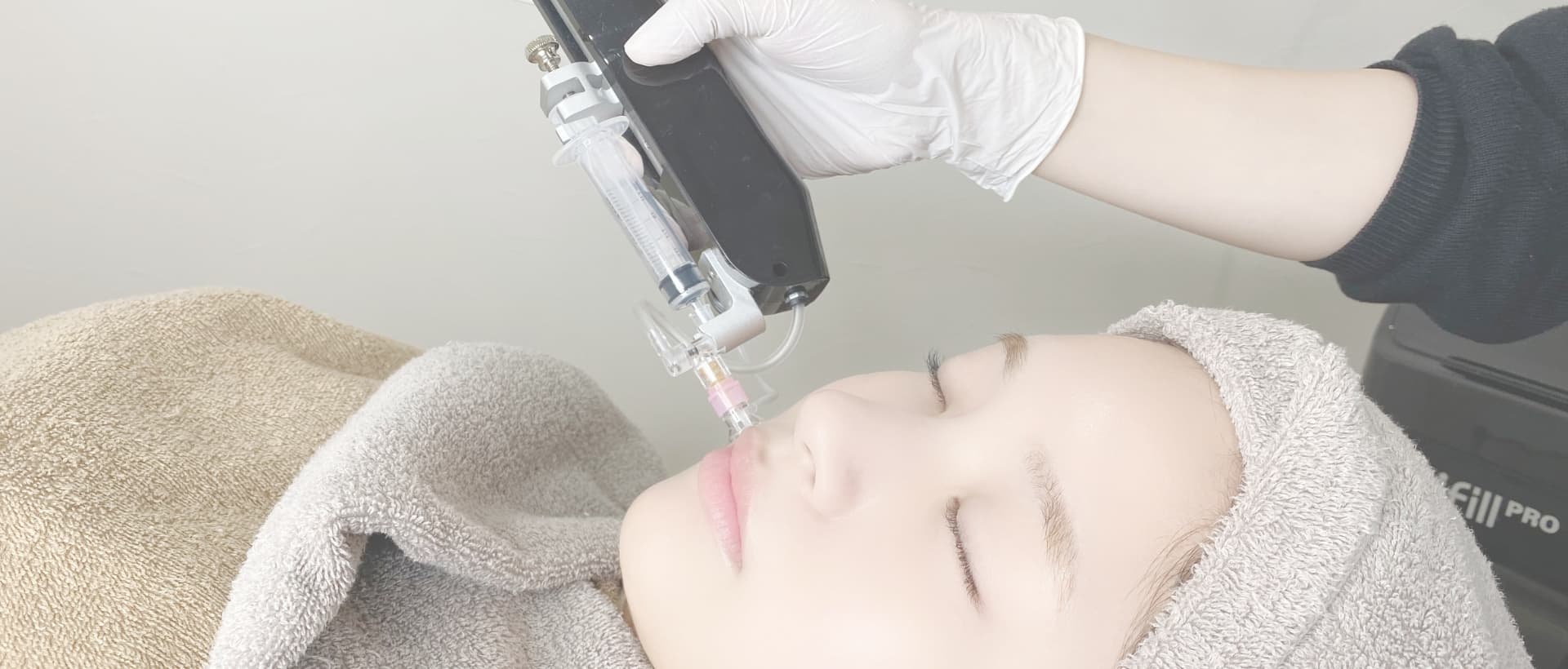 この手法は機器が皮膚を吸引しながらお顔全体に薬剤を注入します。水光注射に似ていますが、トライフィルプロでは薬剤を注入する前に、炭酸ガスを使用して皮内に剥離層を作成し、空洞ができた剥離層に薬剤を導入していきます。オートインジェクションでは主に肌のリジュビネーション(若返り)、小じわの軽減毛穴の引き締め、および肌質の改善に効果的です。