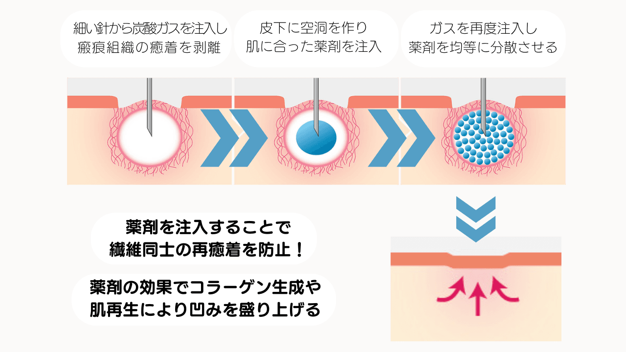エリシスセンスは極細の針の先端からRFの熱と薬剤を注入することでコラーゲン増生を促し、ハリ・弾力の向上、肌質を柔らかくする効果がございます。肌質を柔らかくした状態でトライフィルプロのCO2ガスを注入することで皮下の瘢痕、癒着が分離しやすくなり、エリシスセンス単体の施術よりも皮膚の再生、凹凸の改善が期待できます。